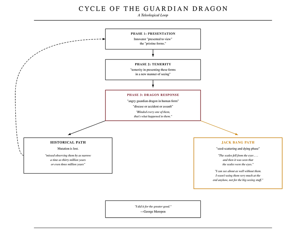 The scientific observation of the mutation is conducted by Lafferty’s recurring character, Doctor Velikov Vonk, who is here the head of the Probability Division of Creative Mutations. He treats the Jack Bang event as a battle to make a beneficial mutation permanent. Vonk notes that “only one mutation in a million is likely to be of benefit,” and he tracks the viability of Jack’s condition through the coin-flipping predictions of one of Lafferty’s most memorable characters, Flip O’Grady, a hot-handed chimp who can affect zones of probability. Over the course of the story, the mutation becomes contagious. It infects those around Jack, including Katherine Hearne, who says that Jack’s new gaze gives her the creeps. It is strange to be observed so thoroughly. Jack’s prominence and success, however, soon bring out the dragon in the form of George Meropen, who threatens him repeatedly.