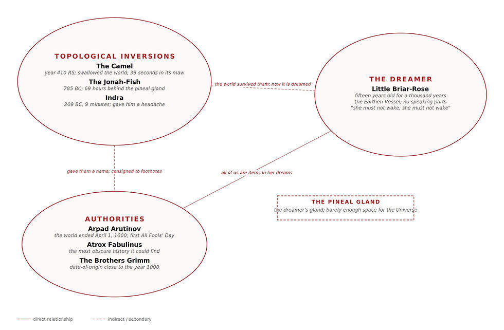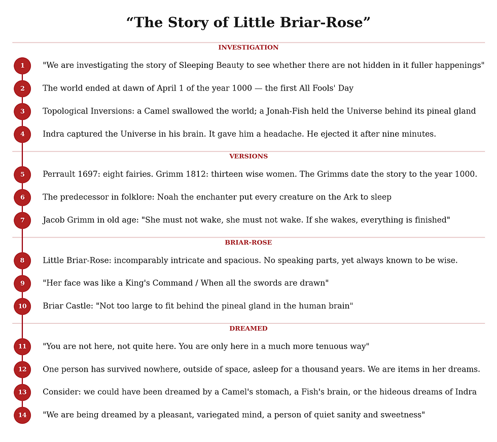 What was the consequence of the unobserved apocalypse, the topological timeline that took us away from the Parousia? It is the “real story” of Briar-Rose and the truth of our current existence: we are all living inside her dream. Briar-Rose is the lone survivor of the world that perished, and she now dreams in a “nowhere place, outside of space.” Sleeping Beauty is not simply a cursed princess; she is a cosmic sustainer, an intercessor: “The Dreamer is fifteen years old, and she has been fifteen years old for nearly a thousand years.”