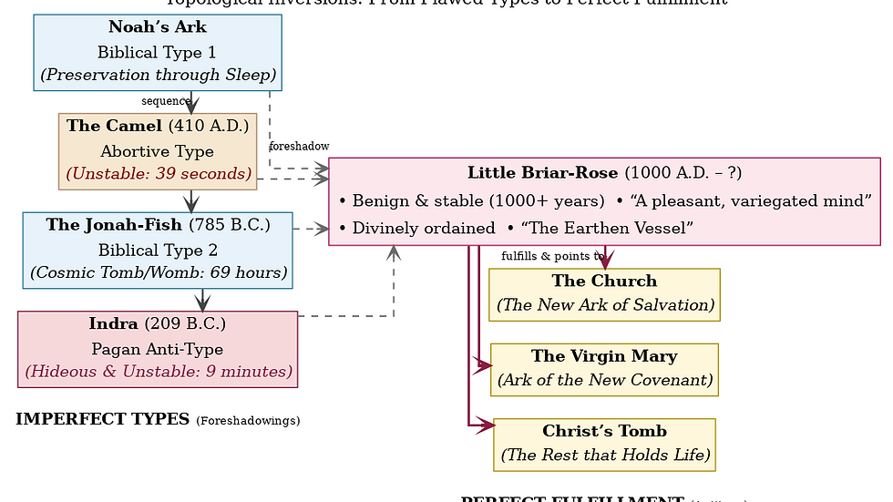 In the same way, Briar-Rose’s sleep sustains life at the very moment when ordinary existence would have been destroyed. If Mary is the antitype of the ark (womb : hull : : Christ : passengers) then Briar-Rose is the antitype of the sleep that falls over the ark (Noahic apocalypse : Ark sleep :: 1000 AD apocalypse : Briar-Rose’s sleep). It is as if the Marian imagery of the rose has been pulled away from the explicitly incarnational and into the tardemah that ends an age, though even that is not so simple.