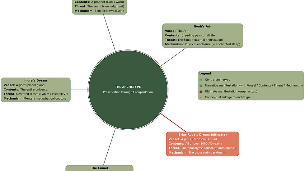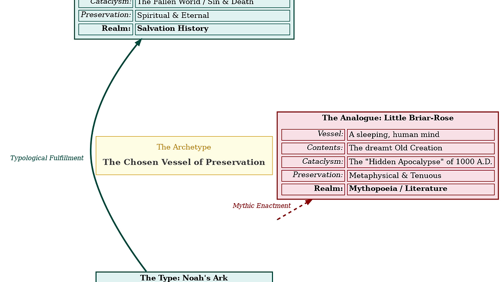 Noah’s role as an enchanter shows sleep as a form of preservation within the refuge of the ark. By placing the animals, his family, and himself into slumber during the flood, he suspends creation in a state where survival no longer depends on ordinary effort or provision. This is prefigurative of Briar-Rose. The ark is both a vessel of wood and a vessel of sleep, carrying the world across catastrophe through an interval of dreaming.