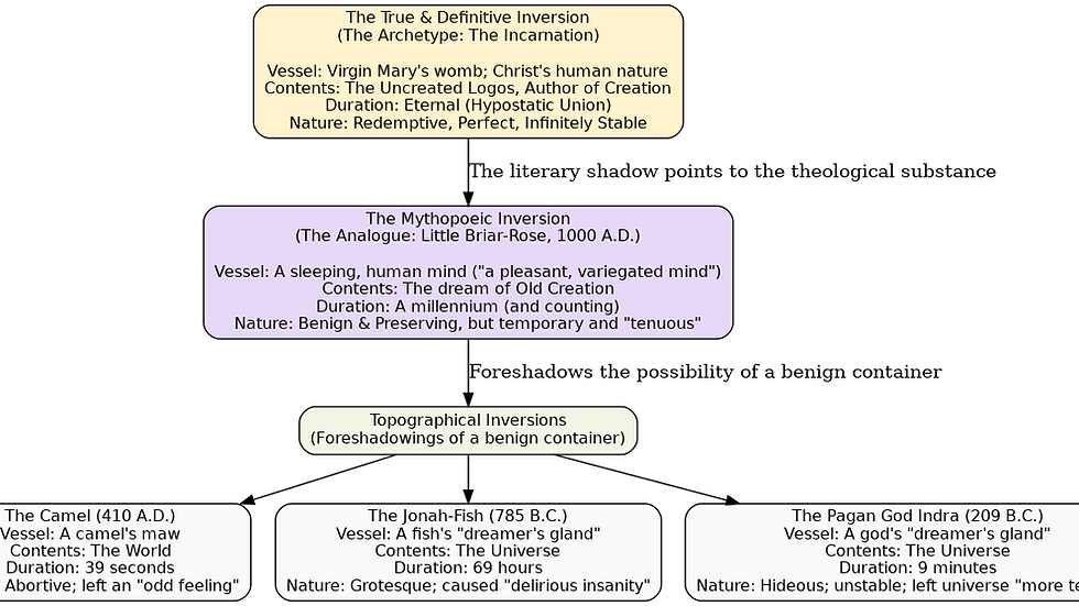 To uncover these, Lafferty’s narrator establishes a pattern of “Universal Inversion” or “Topological Inversion.” This is important, not just science fiction babble. Topological inversions are events where a larger reality is contained within a smaller vessel—for example, according to Atrox Fabuilinus, a 785 BC incident in which a “huge fish swallowed the entire Universe and retained it . . . behind the pineal gland,” or a similar episode involving the god Indra. These precedents are the conceptual foundation for what follows. I’ll show my cards: the greatest topological inversion, as Lafferty knew, is the Incarnation. The preceding topological inversions are failed typology, what St. Jerome called seeds of the Word, figurations of Christ in the myths of the pagans.