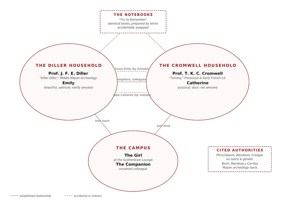 Everything is resolved when the real Professor Diller arrives at the house, accompanied by Cromwell’s actual wife, Catherine. Cromwell remembers. Emily is amused by the confusion, but Catherine is frustrated, since Professor Diller has made the same mistake at her home. The two men swap notebooks. Cromwell finally reads his own instructions and returns to being a professor of Provençal and Early French literature. The story ends by jokingly blaming the wives for making the two reminder books look so similar.